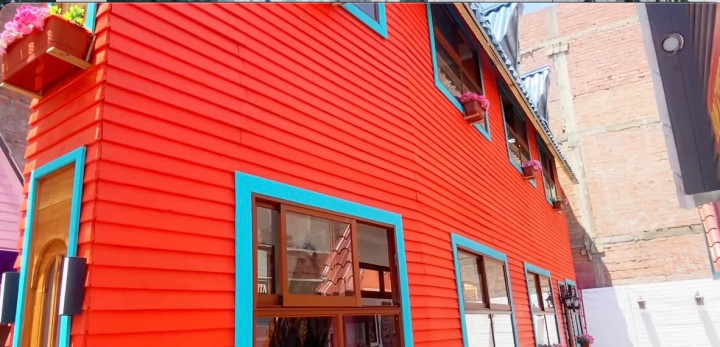这座房子位于奥卡亚马市广场的对面,远远望去就像一面红墙…